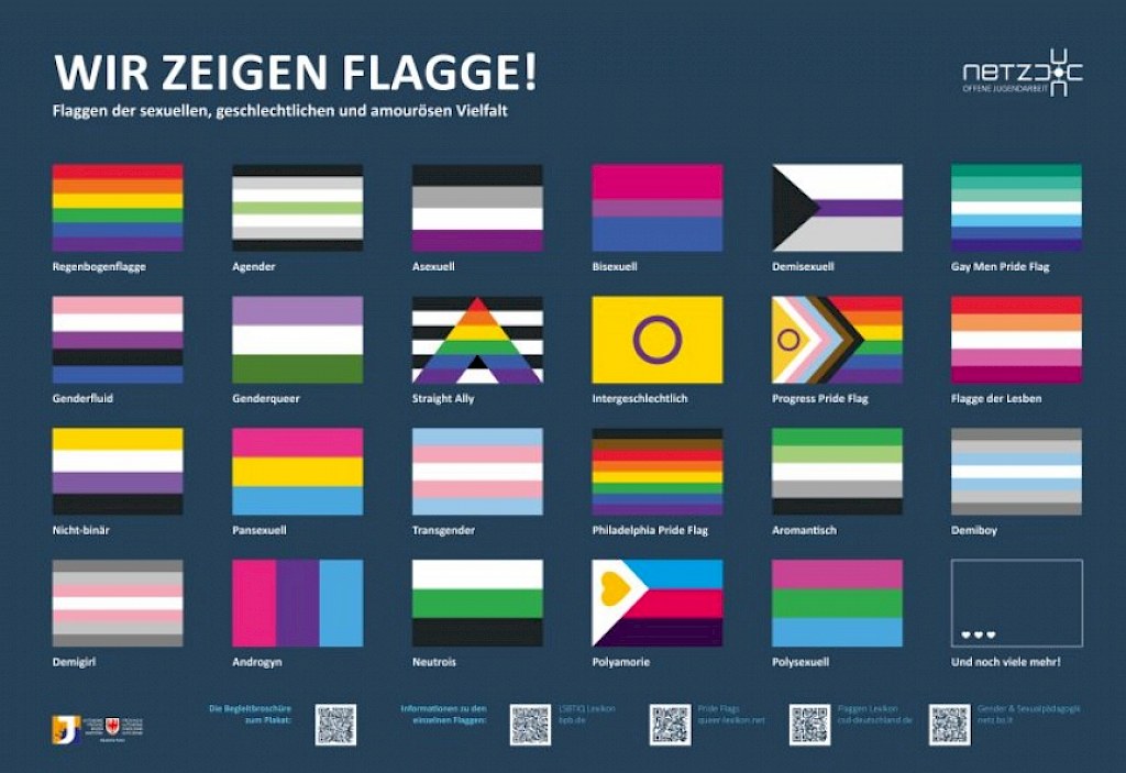 „Wenn es so viele Möglichkeiten gibt, weiß ich gar nicht mehr, wer ich bin!“ Das ist eine der Fragen, die in der neuen Broschüre „Wir zeigen Flagge – Antworten auf häufig gestellte Fragen“ beantwortet wird. netz | Offene Jugendarbeit und das Queere Chaos Kollektiv Innsbruck haben gemeinsam die Broschüre erarbeitet, um die Fachkräfte der Jugendarbeit in Gesprächen mit Jugendlichen rund um das Thema sexuelle, geschlechtliche und amouröse Vielfalt zu unterstützen. Die Veröffentlichung entstand als Reaktion auf die unterschiedlichen Rückmeldungen zum 2022 eingeführten Poster "Wir zeigen Flagge!". Dieses zeigt eine Vielzahl von Flaggen, die für unterschiedliche Geschlechtsidentitäten, Beziehungsformen und sexuelle Orientierungen stehen. Ziel war es, Jugendliche in Jugendeinrichtungen für Inklusion, Sichtbarkeit und Akzeptanz queerer Vielfalt zu sensibilisieren.